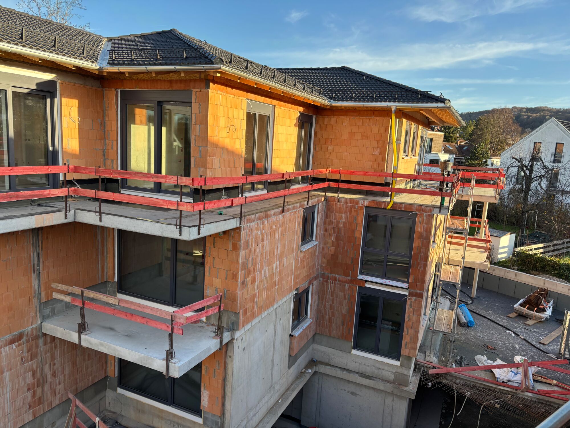 Beide Gebäude fügen sich mit ihren zurückversetzten Terrassengeschossen, der ansprechenden Fassadengestaltung und dem eleganten Walmdach perfekt in die hochwertige Wohngegend ein.